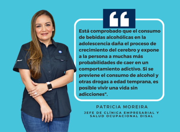 La salud preventiva es otro componente muy importante en Distribuidora Salvadoreña y el llamado a evitar adicciones es clave entre los trabajadores y sus familias. “La calidad de vida debe ser una prioridad para cada persona, es muy importante que la gente conozca que hay conductas que conllevan muchos peligros, por ejemplo, el consumo del alcohol a temprana edad impacta negativamente en el desarrollo cerebral de las personas”, explica la doctora Patricia Moreira, jefe de la Clínica Empresarial y Salud Ocupacional de DISAL.